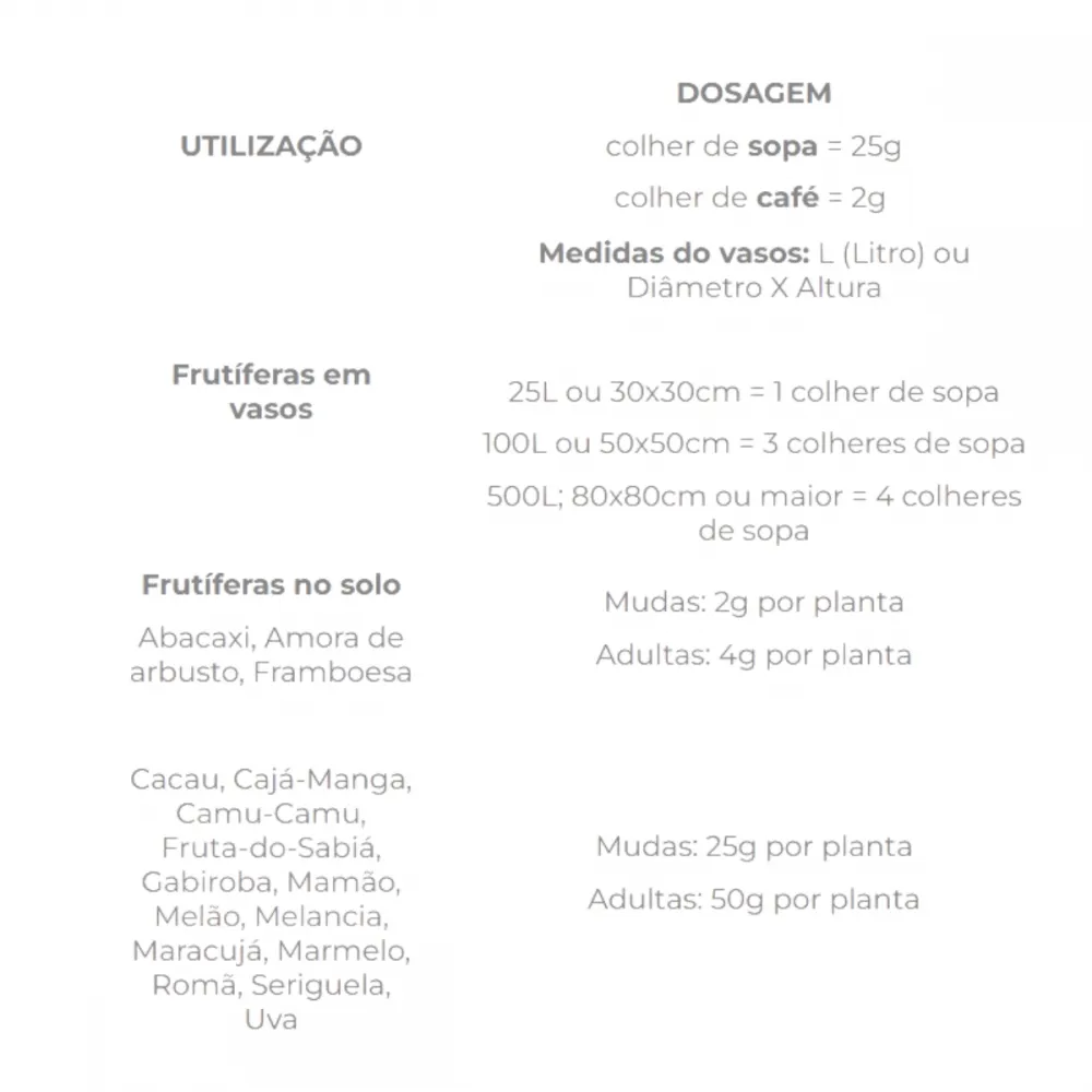 Atenção: Não jogar o adubo nas folhas. Para o plantio das frutíferas utilize o FORTH Plantio. Evitar aplicar nas horas mais quentes e sempre regar logo em seguida aplicação. A adubação com FORTH Frutas deve ser feita somente 30 dias após o plantio.