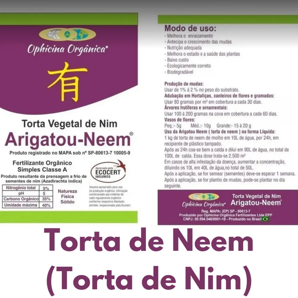 A torta é feita com resíduo da da prensagem a frio das sementes de neem e tem substancias minerais especialmente adequadas a adubação das plantas e proteção conta praga, fungos e insetos. O adubo orgânico Torta de neen é rico em nutrientes vegetais, elimina nematoides, aumenta a população de minhocas, ajuda a mantem nitrogênio no solo, e oferece proteção significativa as plantas contra pragas, fungos, e insetos. Ele pode ser usado no agricultura orgânica.